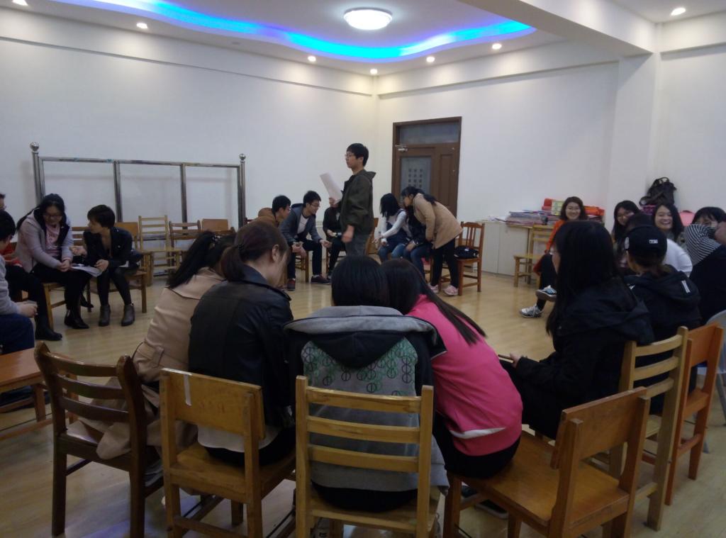 本次活动由暖身阶段、班会阶段、结束阶段三个阶段组成。一共有放松、情绪大头贴、保密原则、情景剧编演、活动心得分享等环节。通过同学们全身心表达,在整个活动中同学们都有了各自的感悟、内省和提升,并在活动尾声期间作了心得的分享。暖身阶段中,在朋辈心理辅导员的带领下,大家放松身体,并进入了兴奋状态。在情绪大头贴环节中,将与会人数均等的分为四个组,随机抽取情绪卡片,并将其串联成四个小故事。经过每组同学细腻的编导以及高超的表演,大家都表现出了各自抽取到的情绪,并辨识出了各种情绪。在班会阶段,首先在朋辈心理辅导员的带领下,与会的各位同学一起做了保密的约定。然后通过分发无差别白纸以及同学们匿名的撰写自己近期的烦恼或者快乐,并将故事随机的分发到四个小组中,通过排演、自愿发言,同学们之间产生了一定的情感共鸣。在结束阶段,部分同学将自己的心得体会写下来与大家进行分享。