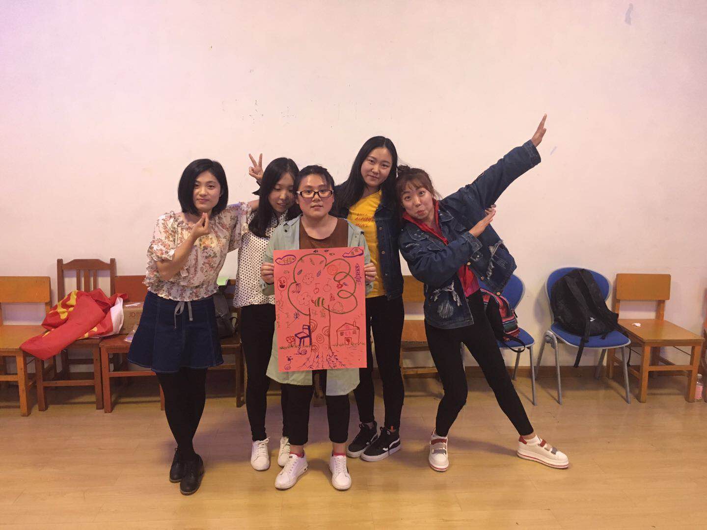 班会开始前,主持人简单的介绍了班会的目的和要求,并希望同学们都能够积极融入活动当中,放松自己,能够收获感悟、自省与提升。在放松阶段,参与者被分成两组,通过喊出名字+喜欢的运动+代表动作,使现场气氛热闹起来,每一位同学都能放松自我然后达到兴奋状态,有了热身的环节,同学们在《人椅破冰》游戏环节中表现的尤为精彩,同学们都发挥了自己的想象力,相互讨论相互合作,原来的陌生感逐渐消失,大家其乐融融。最后,在主持人的号召下,同学们用集体智慧完成的一副画———智慧树,活动圆满结束。