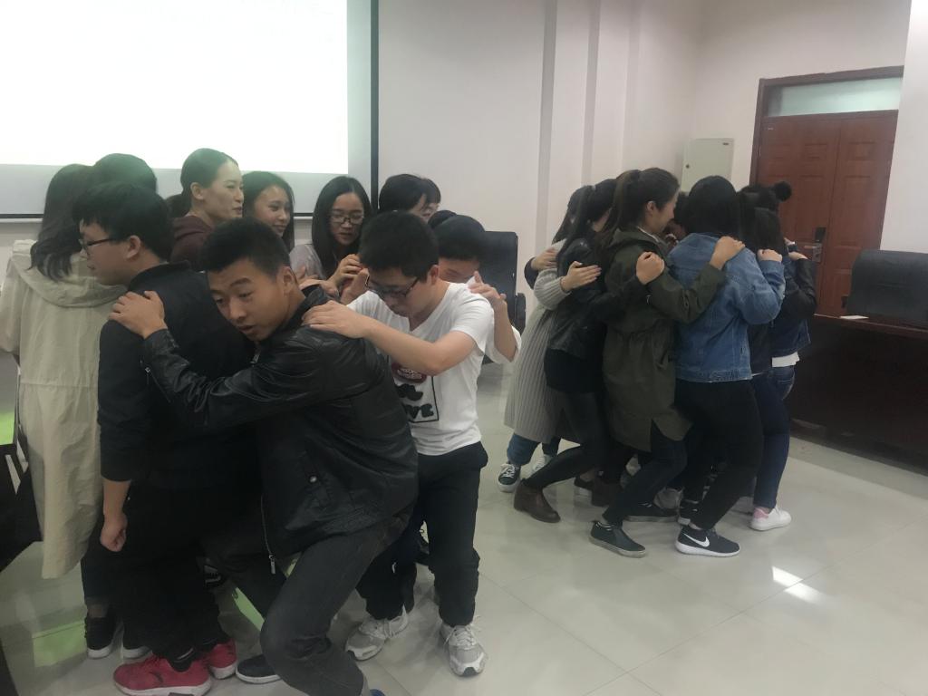 在大家互相了解之后,脸上洋溢着笑容之时,我们开始了下一个游戏:牵手。这个游戏考验大家的记忆能力和对细节的分析能力,因此刚开始大家有点怯场,但是随着游戏的进行大家越来越积极,大家做游戏时,女生慢慢的不在羞涩:“我发现男生们还是挺MAN的。”男生中也有了大胆的声音。“我觉得挺好的。”“挺好的。”。。。男生们几近雷同的感受分享,引发大家善意的阵阵笑声。收到惩罚的同学惩罚措施也是千奇百怪,不一样的惩罚措施也让大家慢慢的放下了心里戒备和害羞,班级氛围逐渐高涨起来。
