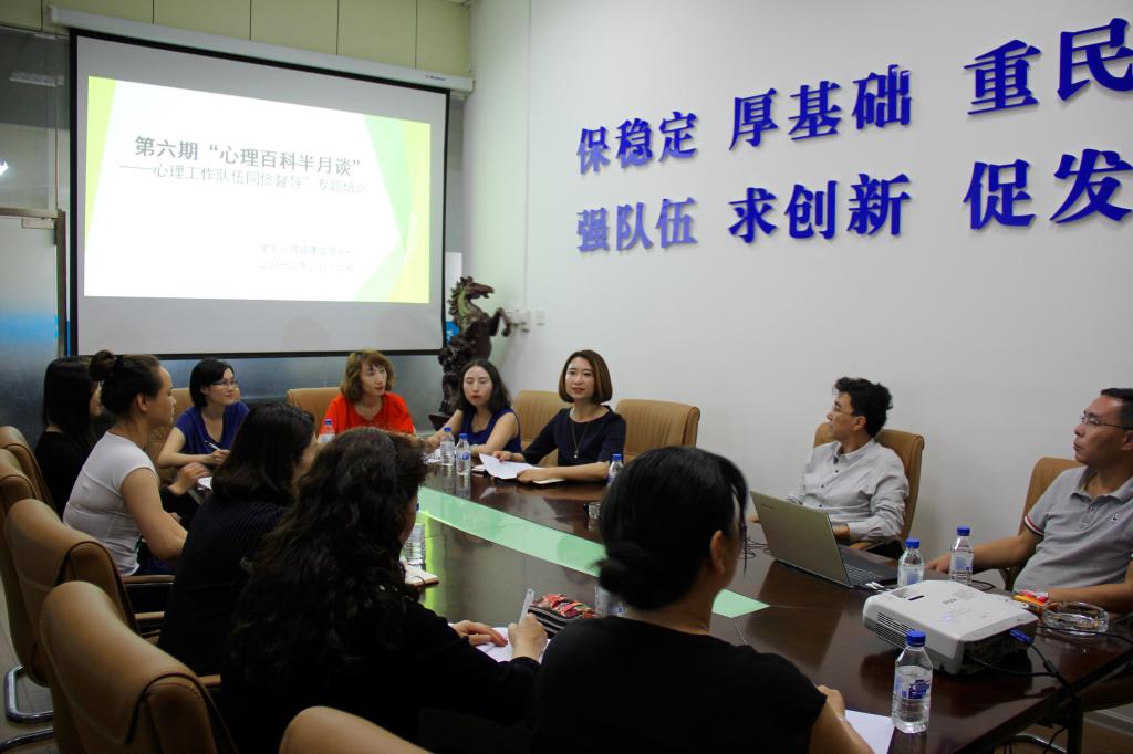 为提升我校心理健康教育工作队伍专业技能,6月16日下午,学生心理健康指导中心特邀西南交通大学心理研究与咨询中心主任宁维卫教授,在田家炳大学生活动中心B座二楼会议室举办了“心理百科半月谈第六期——心理工作队伍同侪督导”。学生心理健康指导中心全体人员、各校区心理素质培养基地心理咨询师等相关人员参加了本次活动。
