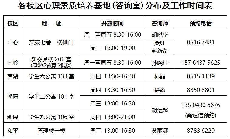 中心在各校区设立学生心理素质培养基地,本着“尊重、接纳、保密”的原则接待学生日常咨询来访及其他心理服务工作。